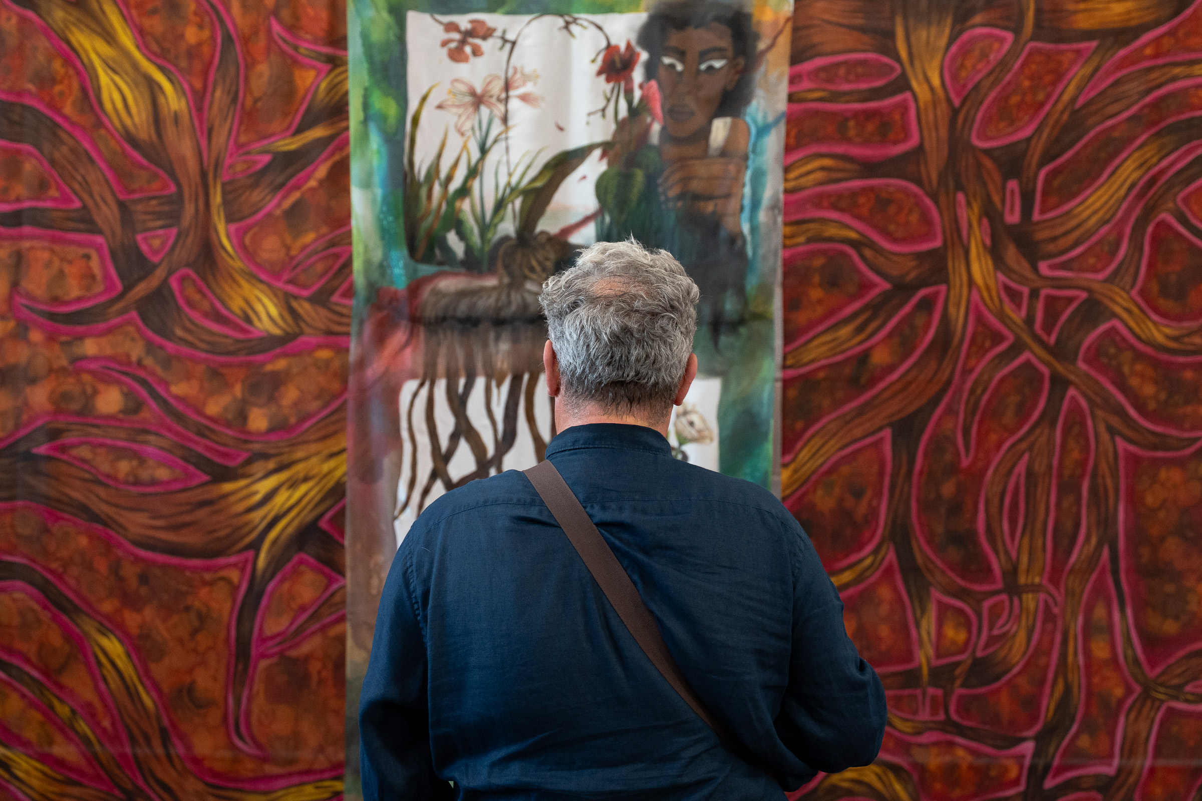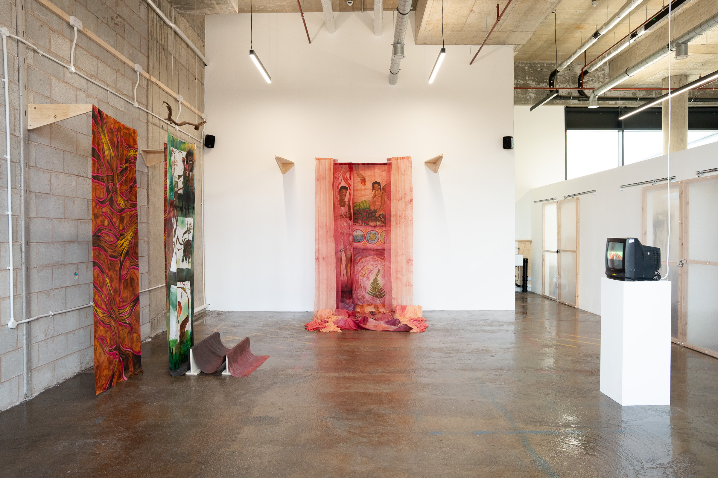 It was such a privilege to be the first artist in that new space. The ceilings are really high, so my first instinct was to work with that verticality. In previous shows I’d used silk hangings in smaller rooms, but here I could scale up.