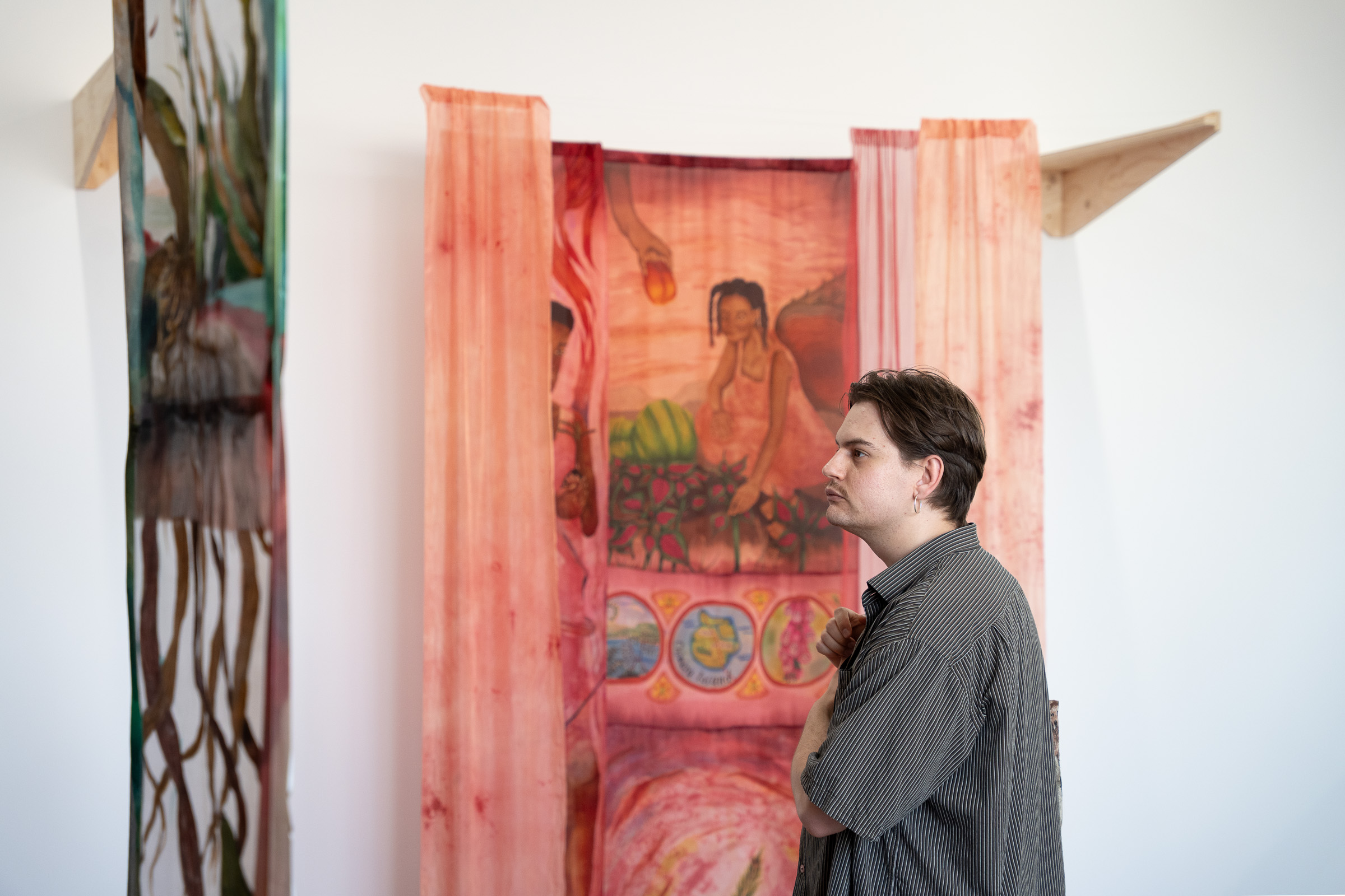 Jessica Ashman is an interdisciplinary artist working with painting, textiles, sound and animation to explore diasporic histories, mythologies and utopias. Her work often draws on her Jamaican heritage and her growing interest in plants, land and storytelling to create richly layered, immersive worlds. Her solo exhibition, Chimera Island, is the first show at Modern Painters, New Decorators’ new purpose-built arts venue in Loughborough, and runs from 6 September to 1 November 2025.