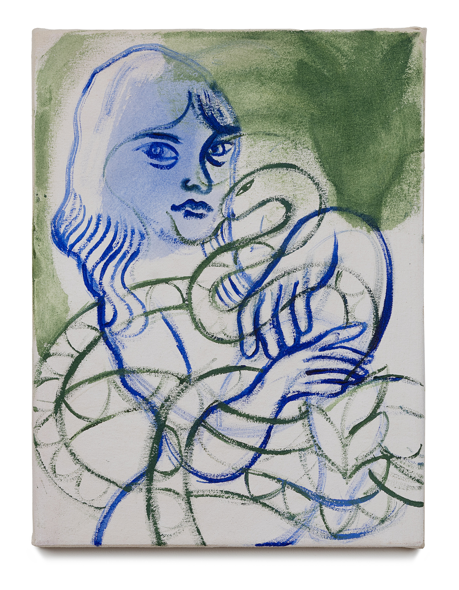 She talks to snakes and they guide her, 2025, acrylic on canvas, 40.8cm x 30.8cm. Image by Andy Bate.