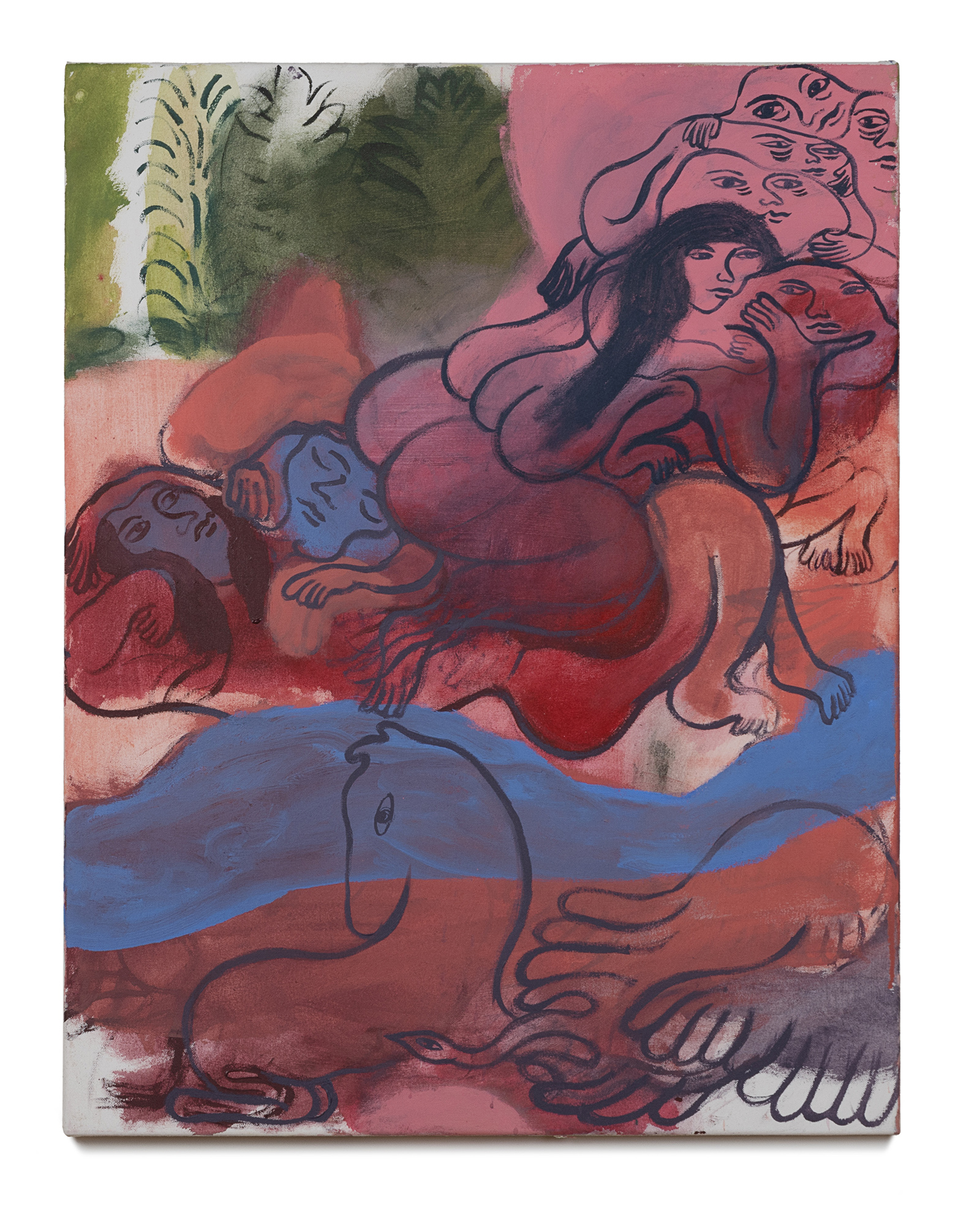 I have found that some kind of structure to the way I work allows for a lot more spontaneity. I start most of my studio days drawing in ink. I begin drawing from life, usually something completely mundane, a self portrait beside a collection of brushes / a view out the window. Then I spend the next hour redrawing from this observational drawing, bringing in my imagination, disrupting the scene, on many sheets of paper, all the same size. This process feels closely linked to stream of consciousness writing (which I do daily when I wake up) and I feel emptied and excited by the exercise. By working fast, and in a short burst, the pressure is off, the valve released and parts of myself are quickly revealed, a tangle of worries, a double self-portrait grapple with myself, the shadow self again and again. It is and has always been a cathartic way of understanding myself and the world. These drawings are the route into the rest of my work.