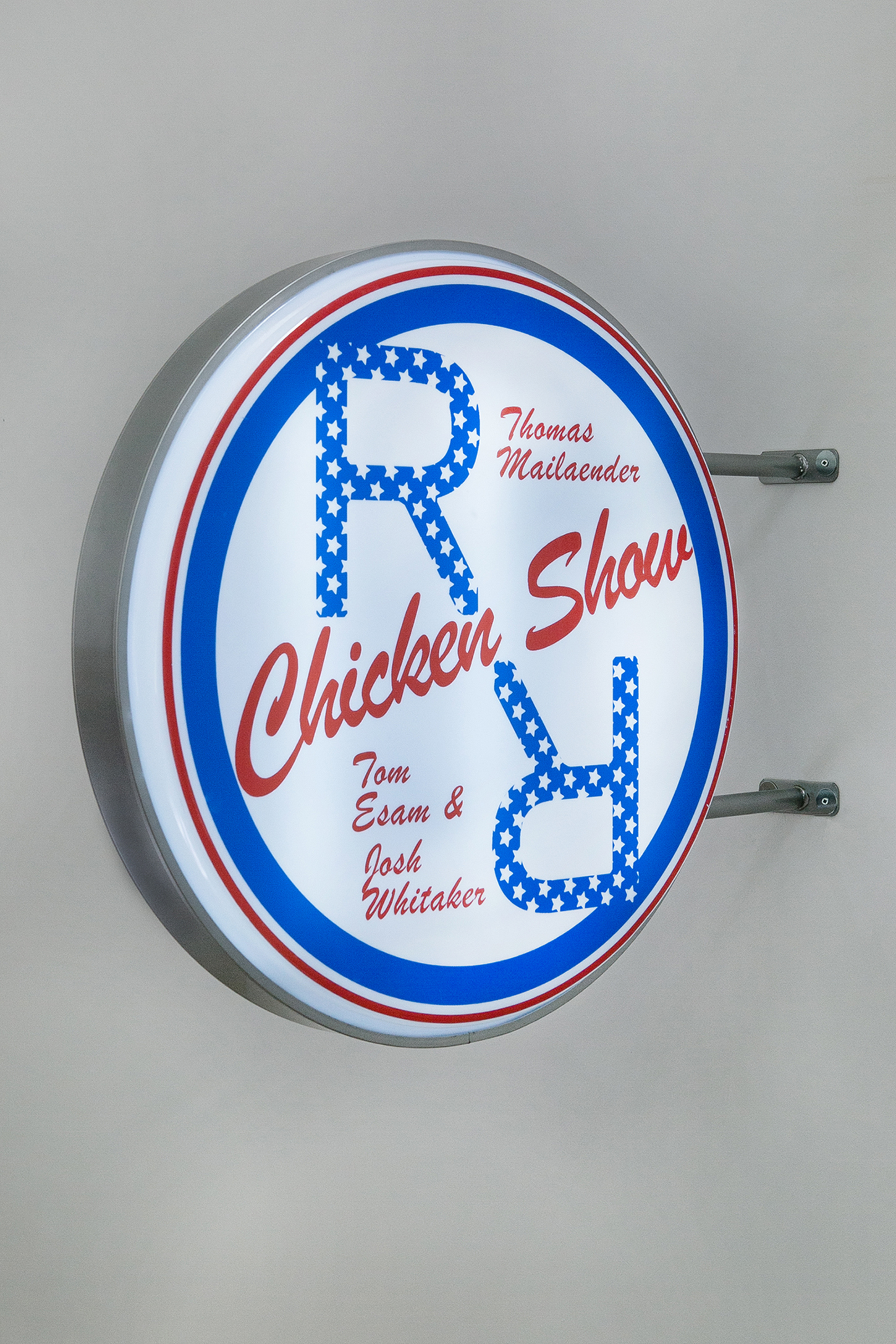 I make the light box works with Tom Esam. There’s a system to them being made which is pretty simple. We make them for a gallery when Tom and me are both invited to show works with them. The signs always refer back to the gallery’s signage, branding or some personality we see them having. They use the typical visual tropes of chicken shop signs. The first one we made was for Marisa Bellani and then we made them for various galleries and people after that. They work as the signage for the show in the first instance, and then they kind of exist as a relic of the show when they are shown again.