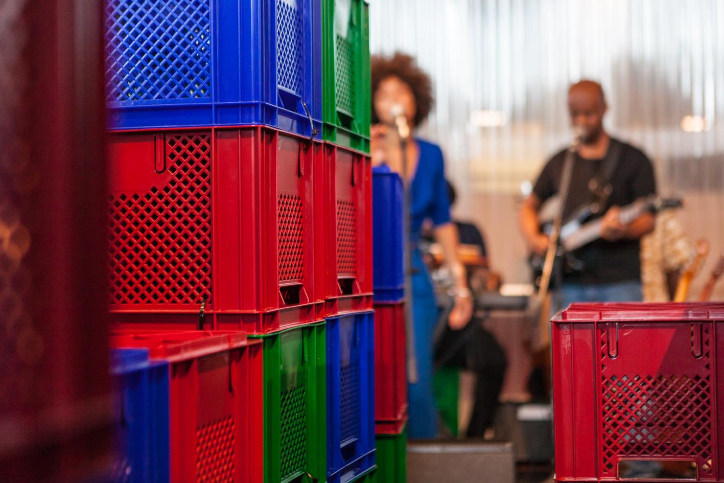 GL: We’d been commissioned by Freo Majer, Art Director at Forecast Festival to create an installation for their Housing the Human Conference at Haus Der Kulturen und Der Welt, Berlin. Our project, Off Grid was a playful response to the austere mathematical models that explain human separation in cities. We made a dynamic, modular stage and meeting area in the foyer from farming crates, a plastic playground.
